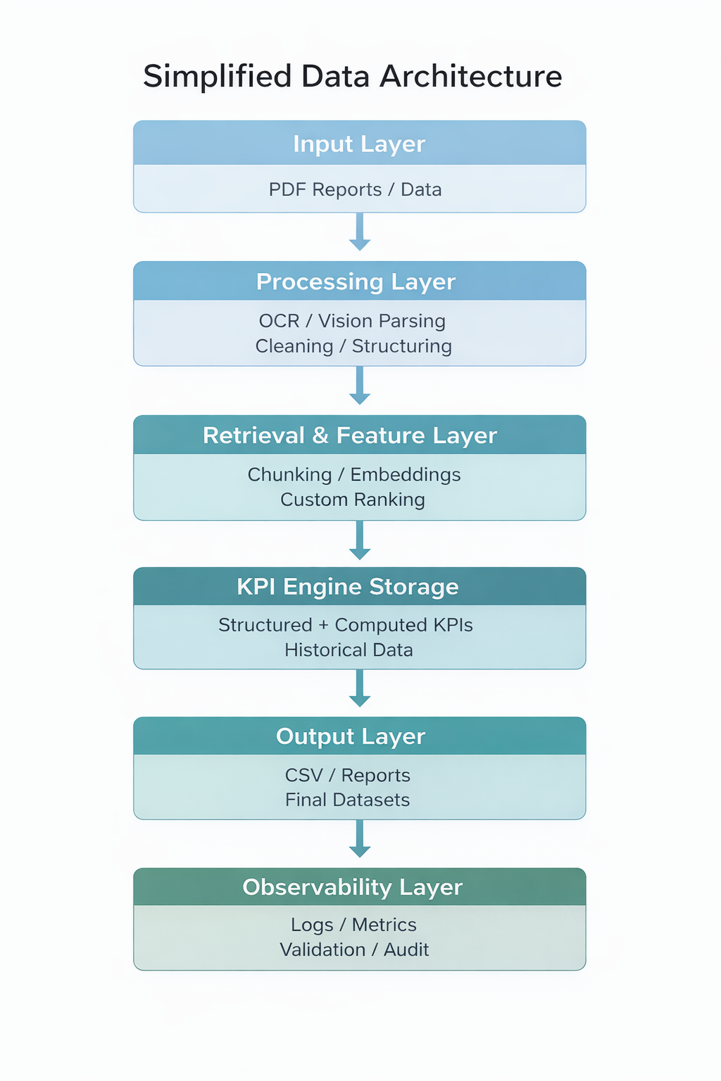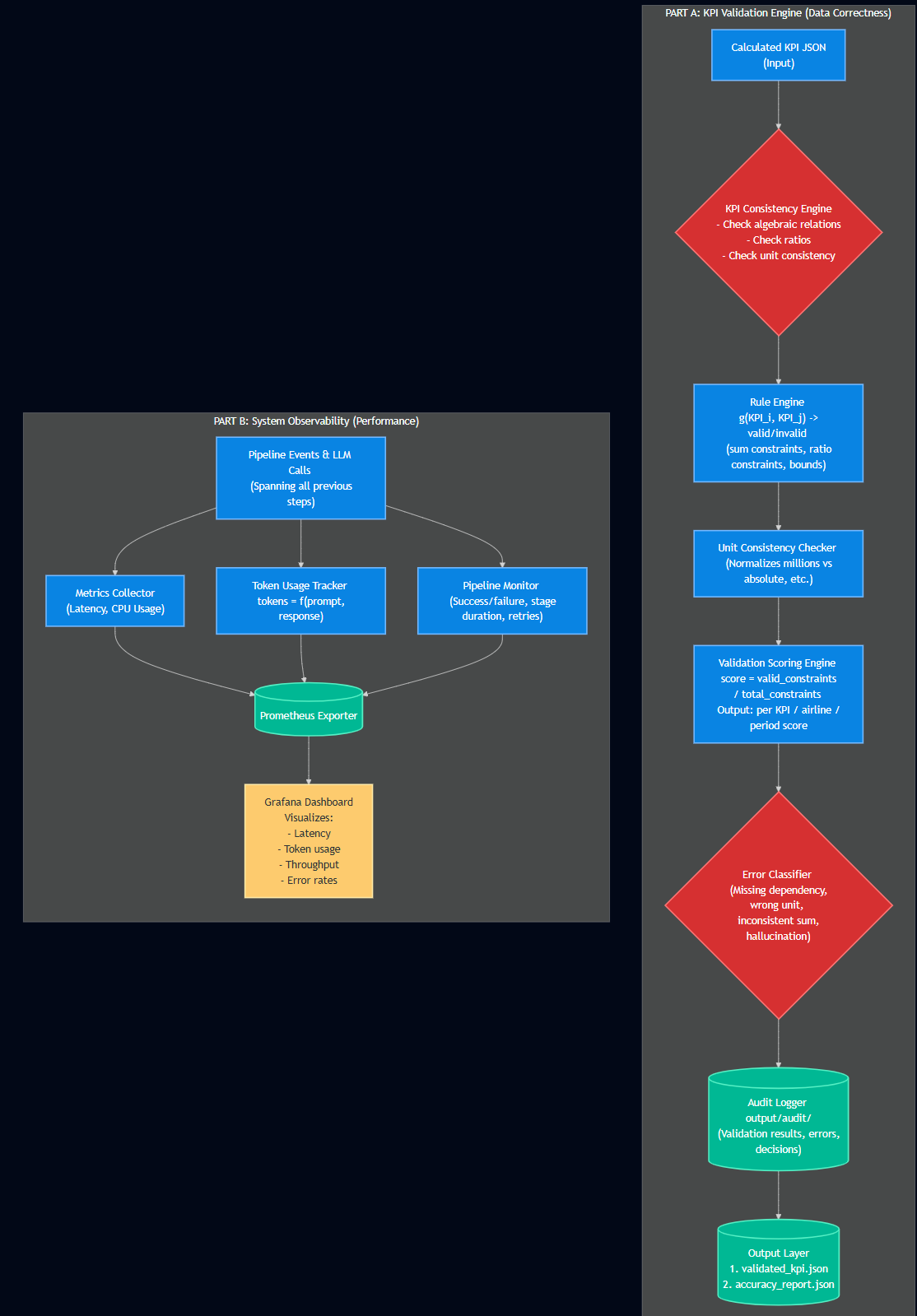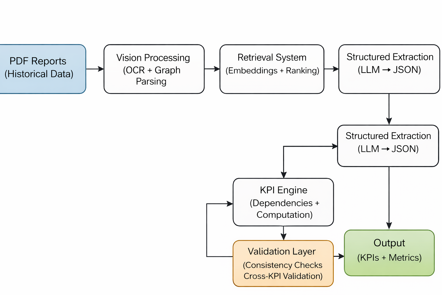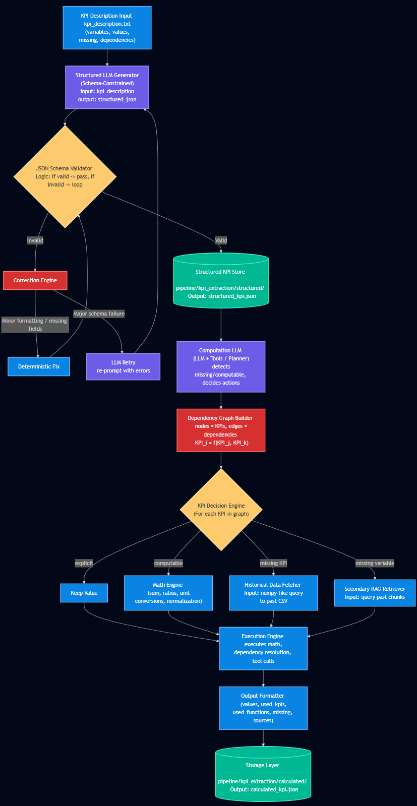 It focuses on turning long, unstructured documents (PDF reports) into structured KPI outputs through an end-to-end workflow: ingestion → extraction → validation/scoring → computation → export.